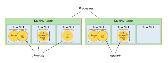 解释完 Task ,我们在解释一下什么是 SubTask,其准确的翻译是: A subtask is one parallel slice of a task,即一个 Task 可以按照其并行度拆分为多个 SubTask。如上图,source & map 具有两个并行度,KeyBy 具有两个并行度,Sink 具有一个并行度,因此整个虽然只有 3 个 Task,但是却有 5 个 SubTask。Jobmanager 负责定义和拆分这些 SubTask,并将其交给 Taskmanagers 来执行,每个 SubTask 都是一个单独的线程。