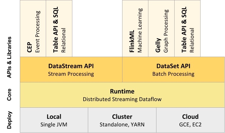 顶层类库:包括用于复杂事件处理的 CEP 库;用于结构化数据查询的 SQL & Table 库,以及基于批处理的机器学习库 FlinkML 和 图形处理库 Gelly。