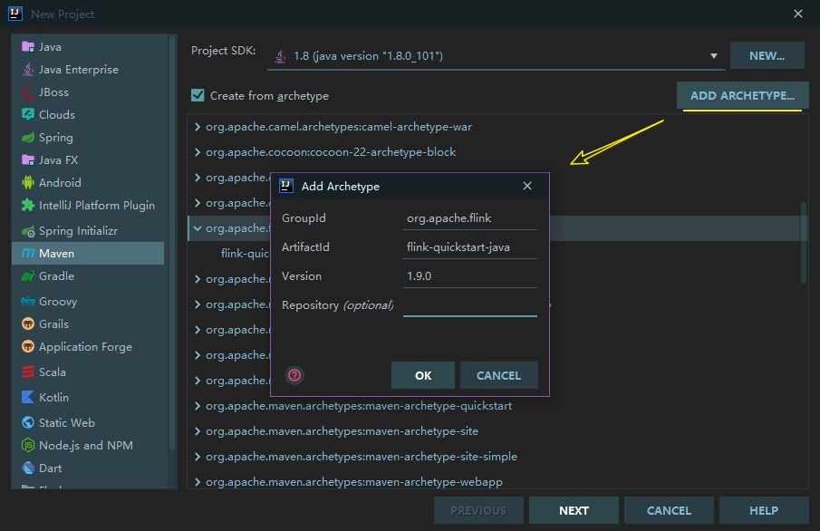 选中 Flink Archetype ,然后点击 NEXT 按钮,之后的所有步骤都和正常的 Maven 工程相同。