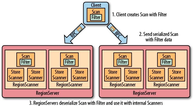 需要注意的是在多台 Regin Services 上执行分页过滤的时候,由于并行执行的过滤器不能共享它们的状态和边界,所以有可能每个过滤器都会在完成扫描前获取了 PageCount 行的结果,这种情况下会返回比分页条数更多的数据,分页过滤器就有失效的可能。