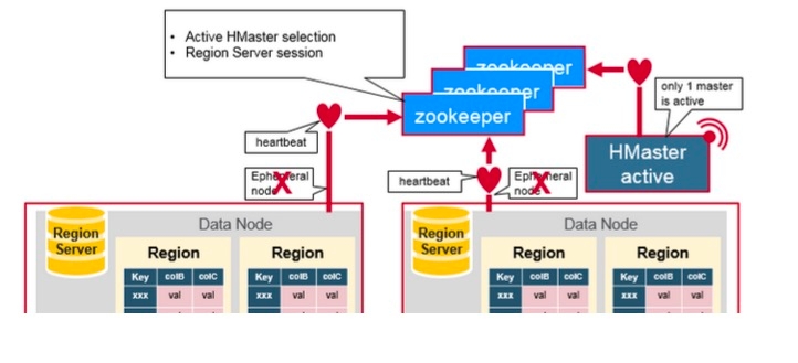 所有 Masters 会竞争性地在 Zookeeper 上创建同一个临时节点,由于 Zookeeper 只能有一个同名节点,所以必然只有一个 Master 能够创建成功,此时该 Master 就是主 Master,主 Master 会定期向 Zookeeper 发送心跳。备用 Masters 则通过 Watcher 机制对主 HMaster 所在节点进行监听;