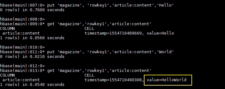 hbase > put 'magazine', 'rowkey1','article:content','World'