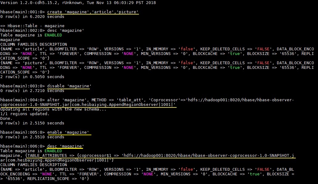 hbase > alter 'magazine', METHOD => 'table_att', 'Coprocessor'=>'hdfs://hadoop001:8020/hbase/hbase-observer-coprocessor-1.0-SNAPSHOT.jar|com.heibaiying.AppendRegionObserver|1001|'
