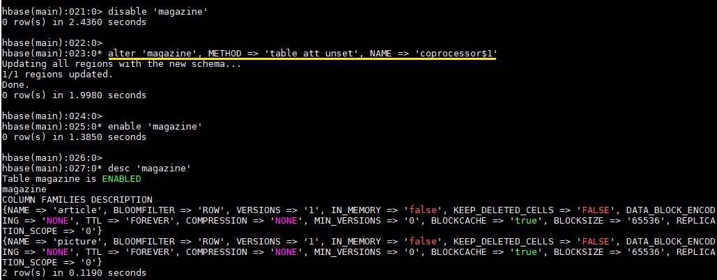 hbase > alter 'magazine', METHOD => 'table_att_unset', NAME => 'coprocessor$1'