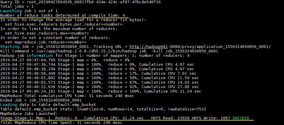 可以从执行日志看到 CTAS 触发 MapReduce 操作,且 Reducer 数量和建表时候指定 bucket 数量一致: