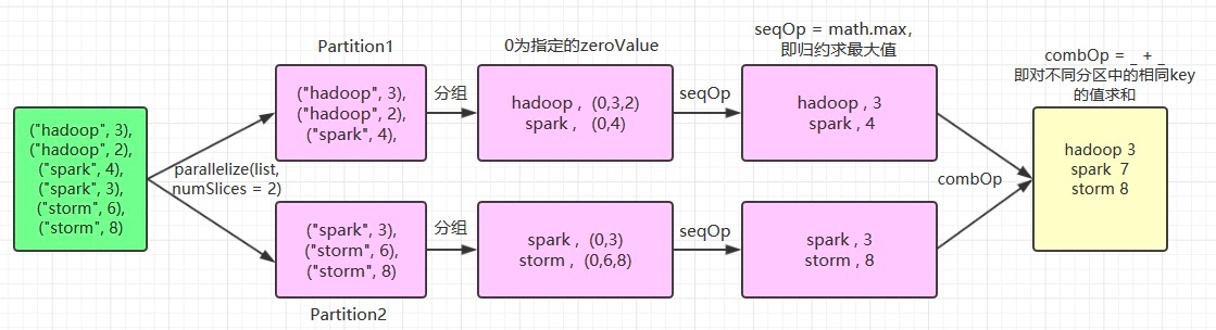这里使用了 numSlices = 2 指定 aggregateByKey 父操作 parallelize 的分区数量为 2,其执行流程如下: