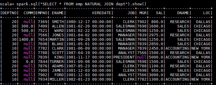 spark.sql("SELECT * FROM emp JOIN dept ON emp.deptno = dept.deptno").show()