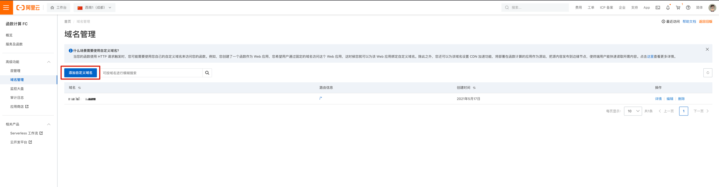 首先在阿里云函数计算控制台点击【域名管理】添加自定义域名。