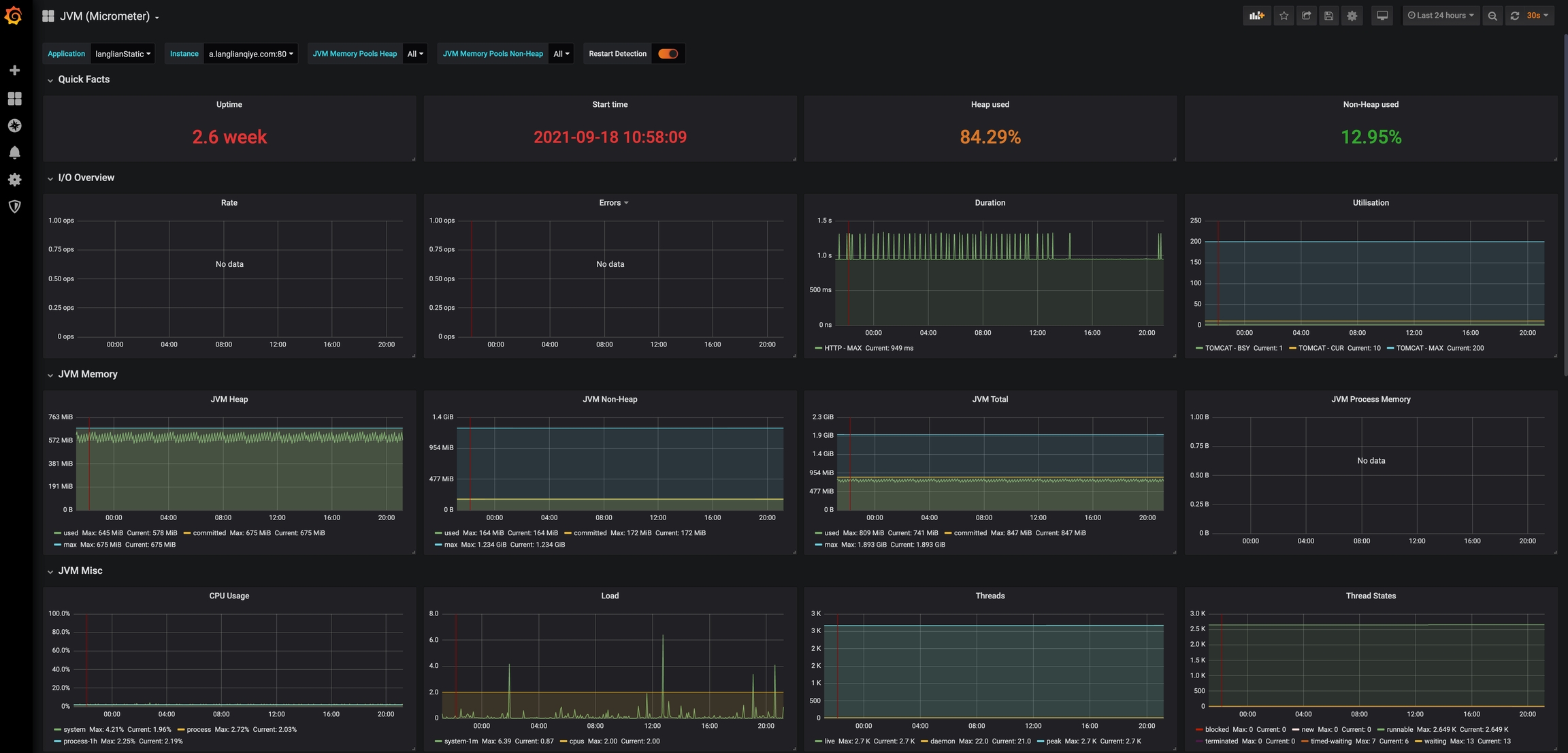 这样,我们就通过Prometheus已经可以看到Spring Boot不同指标的监控数据了,那么为什么还需要Grafana呢,不集成Grafana也是可以的,但是通过Grafana,我们可以更加方便快捷的可视化的查看监控数据,最终的成果如下图所述: