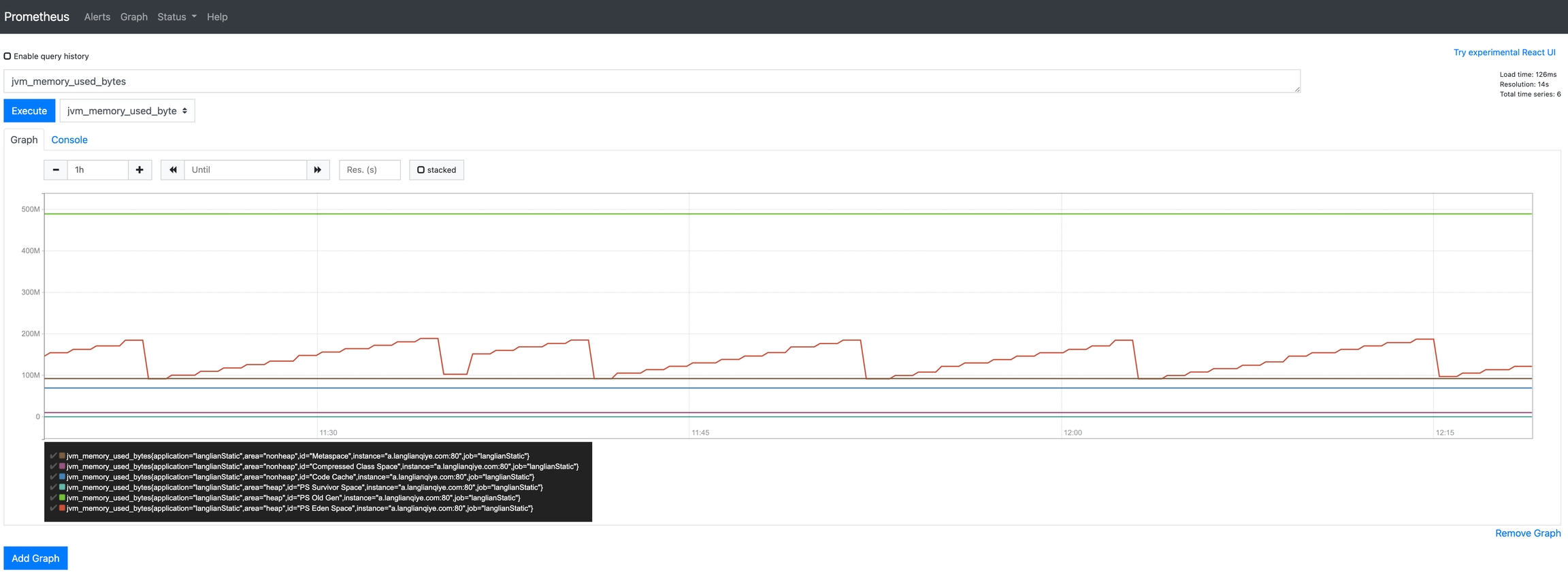 然后,可以查看不同指标的监控数据,比如jvm_memory_used_bytes