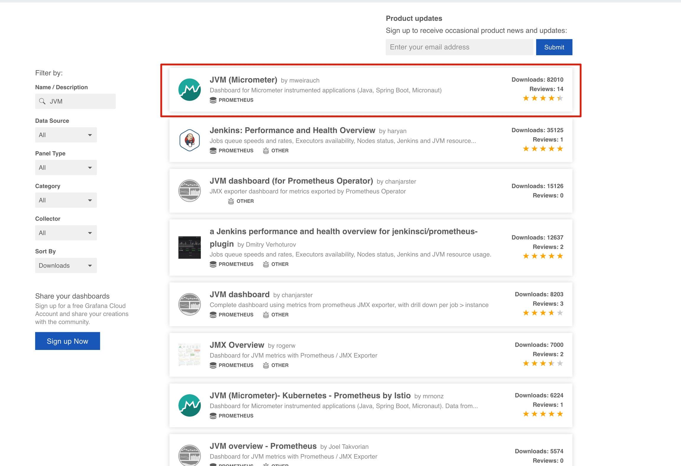下一步就是创建仪表盘,在这里有两个选择,其一是创建新的仪表盘,选择不同的组件,设置布局,还有一种方式是选择grafana官方或者社区提供的仪表盘,而且他们的样式都十分精美,可以直接导入。这里我们选择导入仪表盘,因为我们是Java应用,重点关注的肯定是JVM相关的指标,所以我们搜索JVM,通过安装量进行排序。