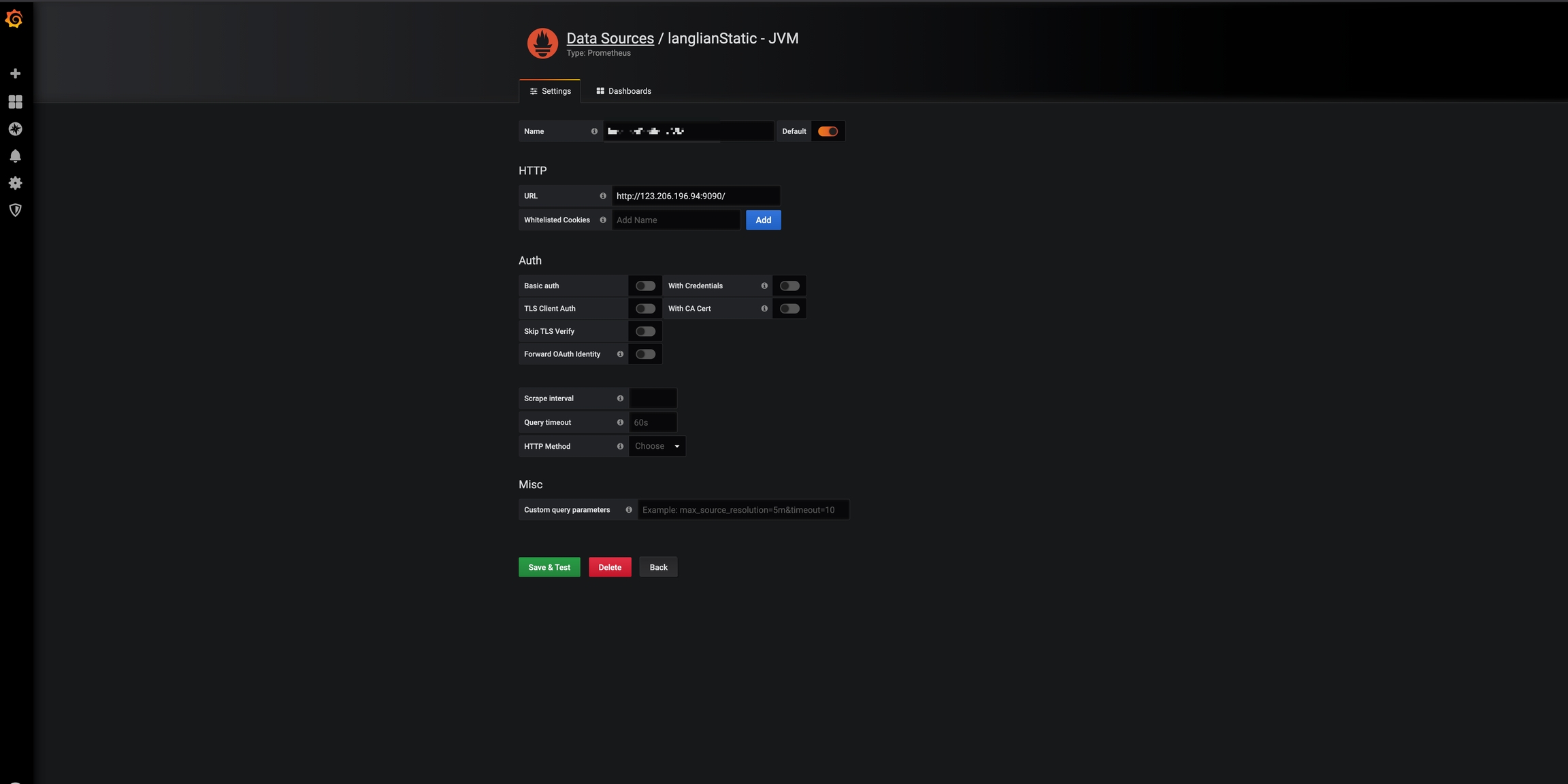 输入数据源名称(任意),Prometheus的url地址,然后点击添加保存。