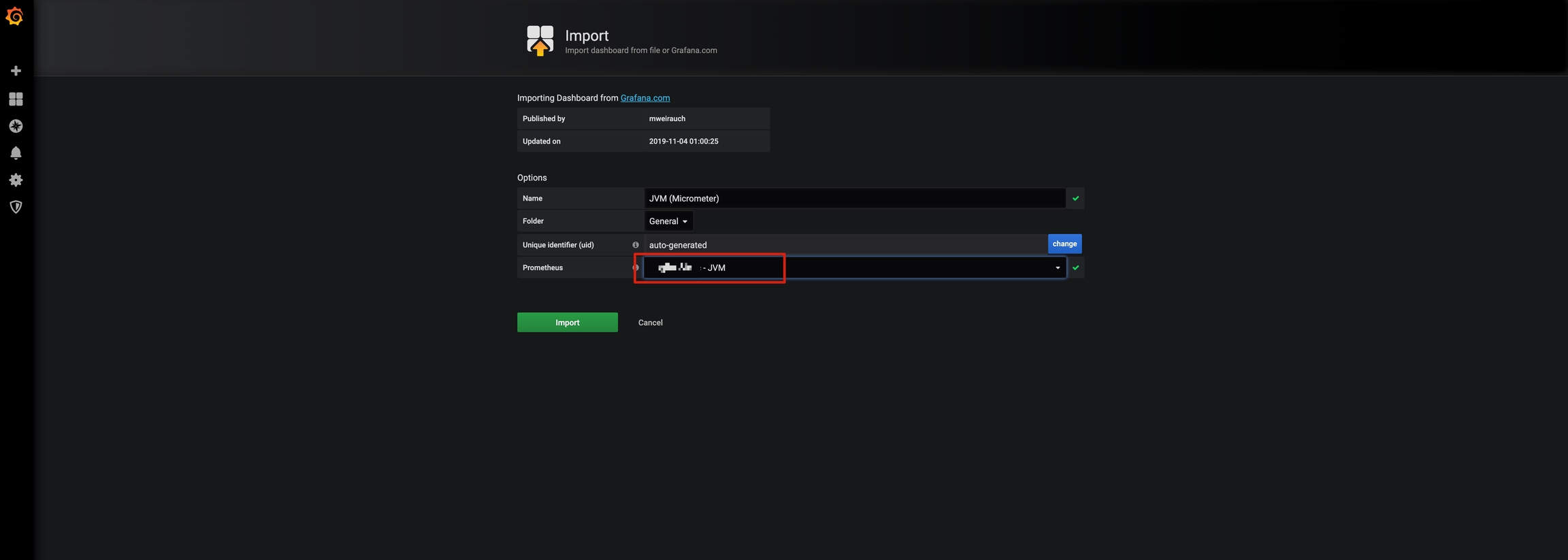 点击第一个,这个仪表盘包含了JVM,线程,CPU等指标,我们就导入这个,当然你也可以选择其他的仪表盘或者自建。
