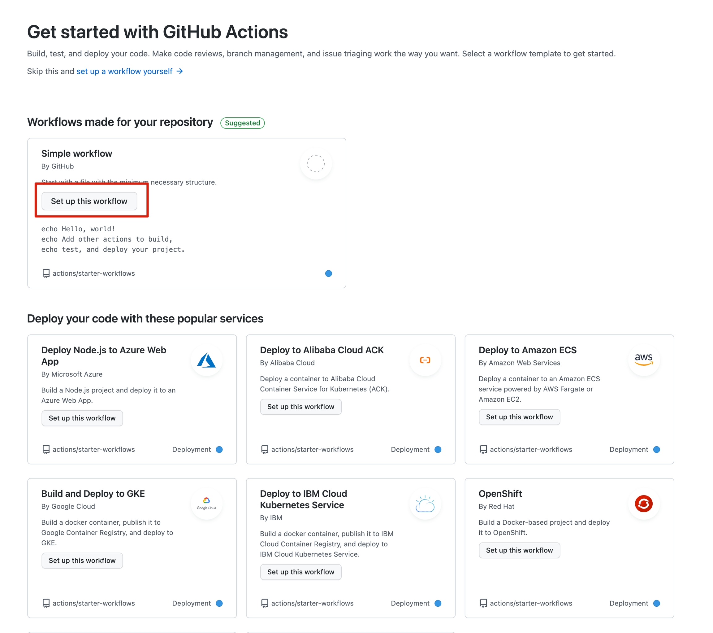在这个页面,我们可以看到官方建议的工作流,还有部署到不同平台和不同语言的非常多的模板供我们选择,这里我们先看官方默认的配置,其他的再熟悉了流程之后可以慢慢研究。
