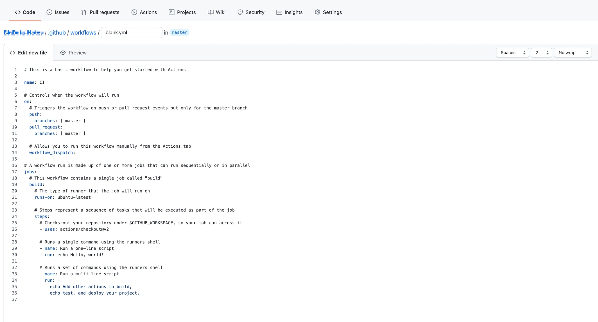 当我们点击了创建工作流后,会在当前仓库.github/workflows目录下创建一个yml格式的文件,这个就是我们工作流的配置文件,在这里我们可以定义触发规则,编译阶段,部署阶段等每一步需要做的事情。