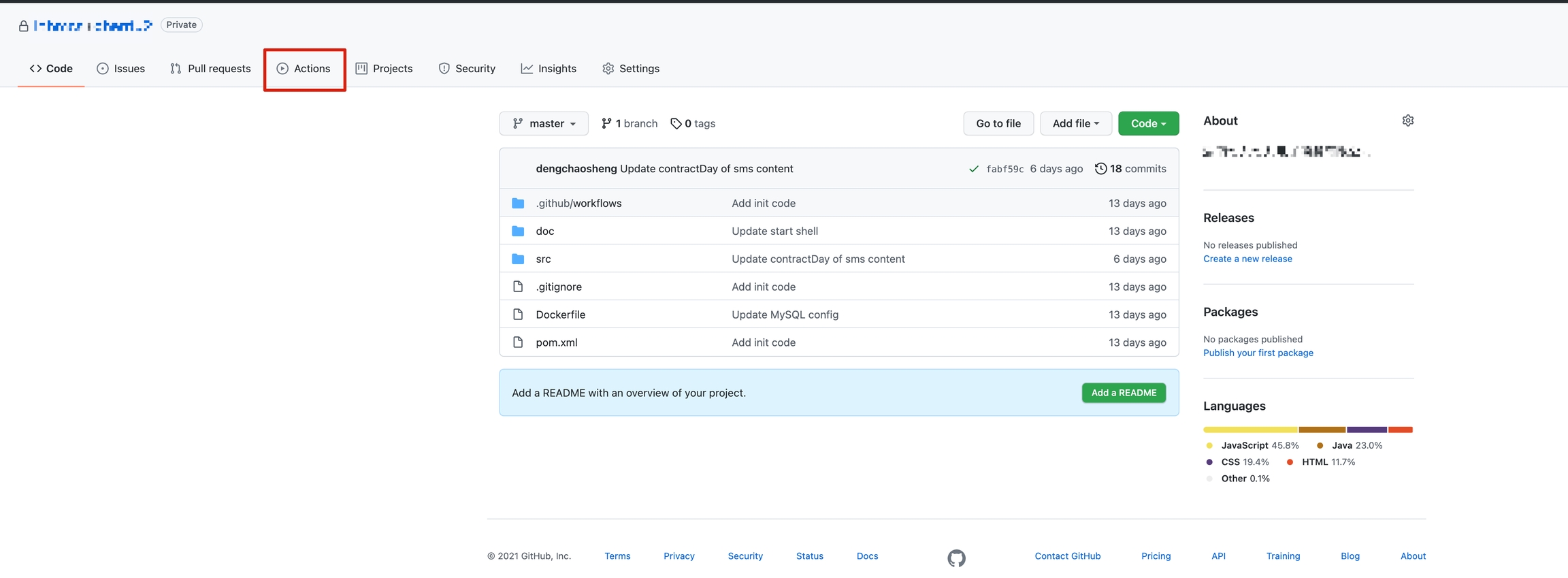 Github Actions顾名思义,肯定是先选择你的Github项目,并且找到Actions功能,如图: