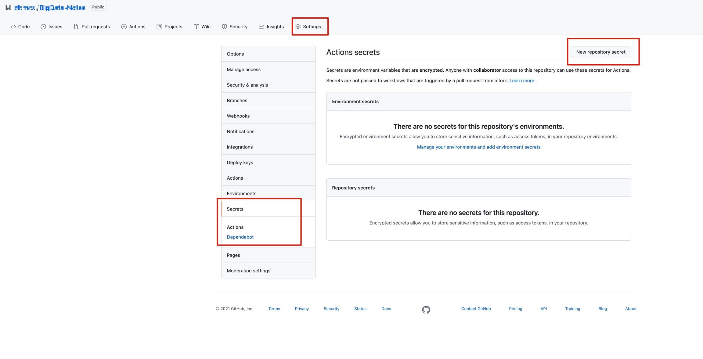 在Github项目里找到Settings中的Secrets,并点击创建密钥,如图所示:
