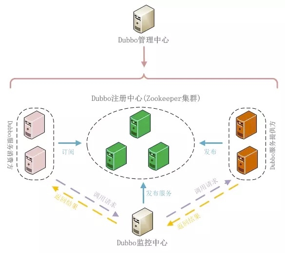 对于以上的3个核心功能,Dubbo有涉及到哪些组件角色,来协作完成分布式治理的呢?