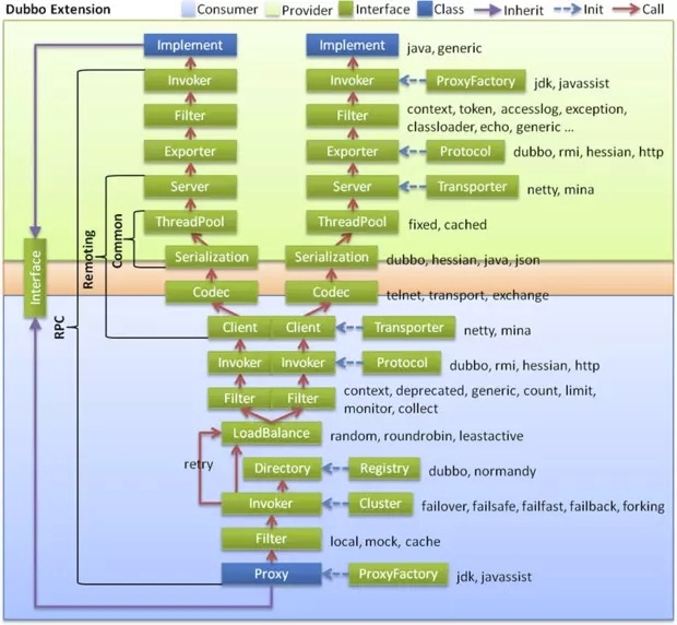 图中的Consumer和Provider是抽象概念,只是想让看图者更直观的了解哪些类分属于客户端与服务器端,不用Client和Server的原因是Dubbo在很多场景下都使用Provider、Consumer、Registry、Monitor划分逻辑拓普节点,保持统一概念。