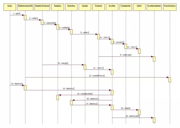 为了满足应用系统的需求,服务消费方的可能需要从服务注册中心订阅指定的有服务提供方发布的服务,在得到通知可以使用服务时,就可以直接调用服务。反过来,如果不需要某一个服务了,可以取消该服务。下面看一下对应的时序图,如图所示: