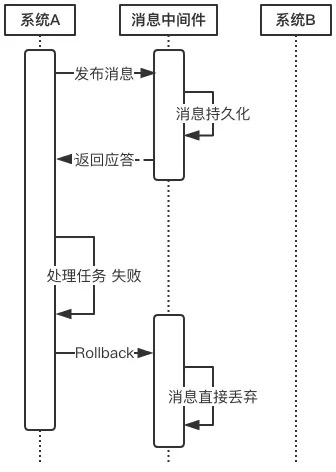 若系统A在处理任务A时失败,那么就会向消息中间件发送Rollback请求。和发送Commit请求一样,系统A发完之后便可以认为回滚已经完成,它便可以去做其他的事情。