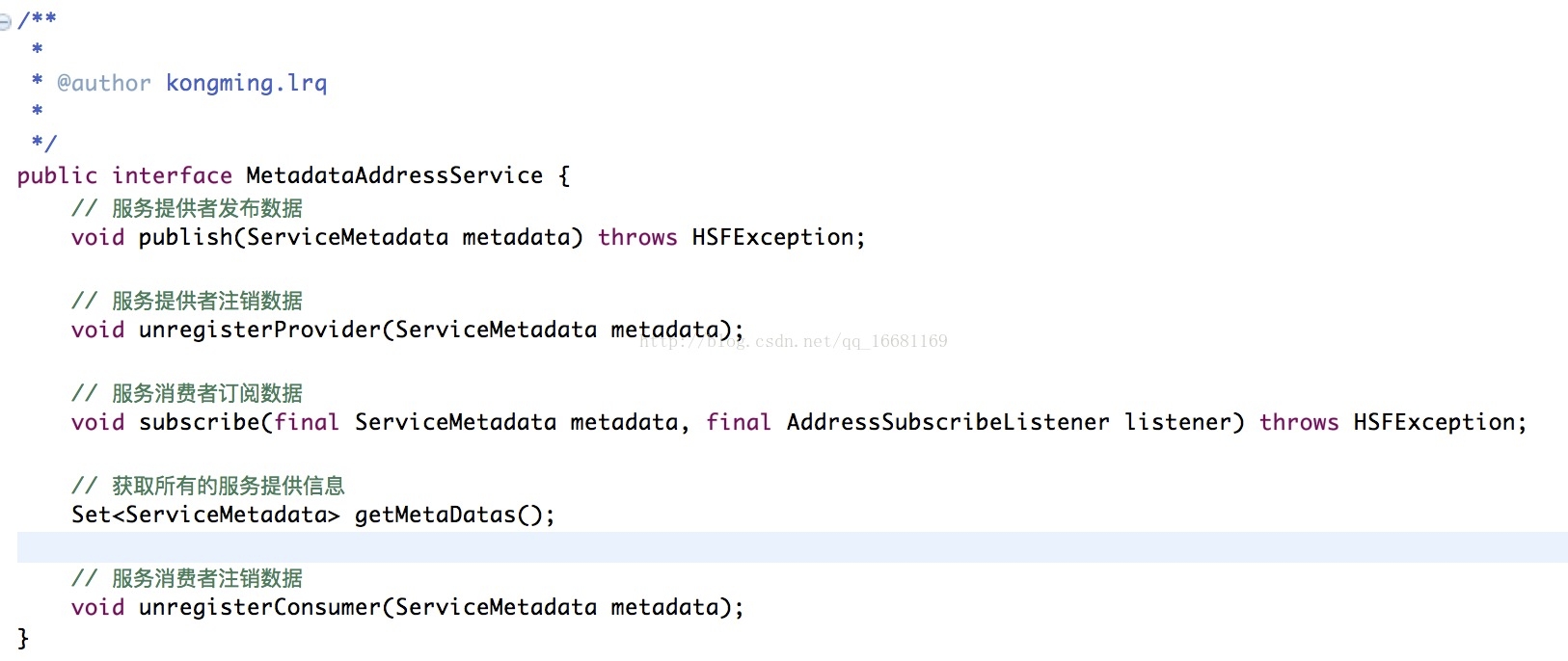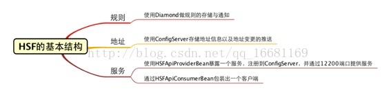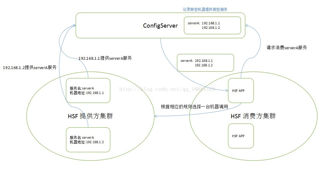 **服务:**服务是调用方和提供方交流的依凭,一般是一个接口,表示一个业务行为以及相关的数据含义。通过使用HSFApiProviderBean能够暴露一个服务,将机器的地址注册到configserver,并且能够通过12200端口进行服务提供,通过HSFApiConsumerBean能够包装出一个客户端,它是服务接口的一个代理,并且它从configserver上订阅了服务的地址列表,能够在这个列表上完成随机调用,做到负载均衡与HA((High Available,高可用性群集)。