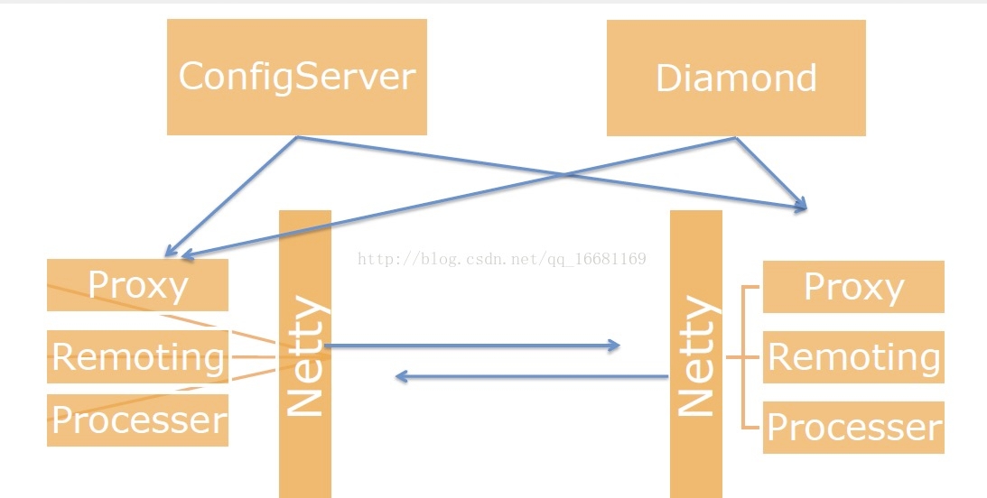 ConfigServer:远程调用对端的地址就是由ConfigServer 来推送的,这样用户只需要配置自己的服务端或者消费端,不需要对自己的地址进行管理。