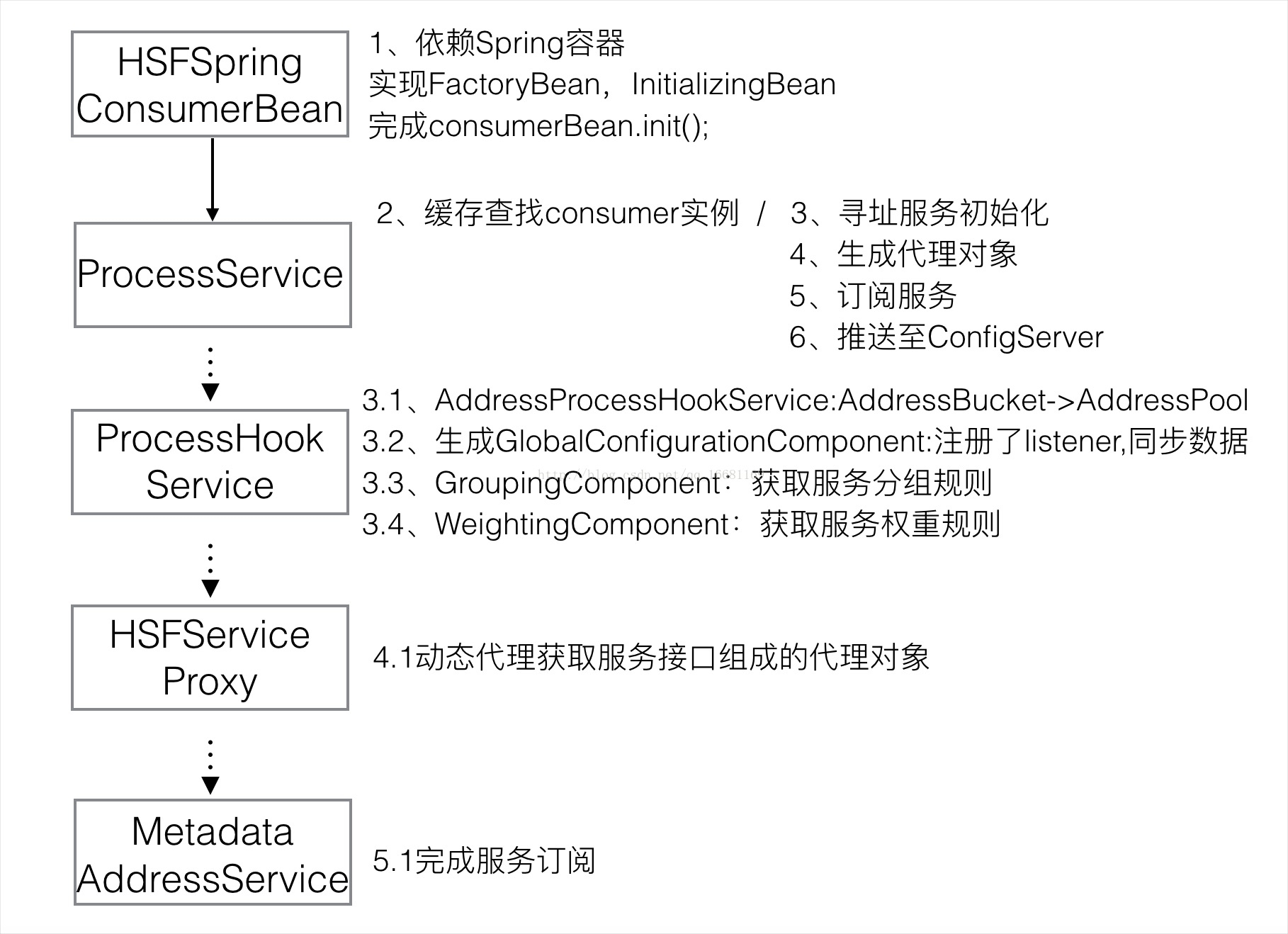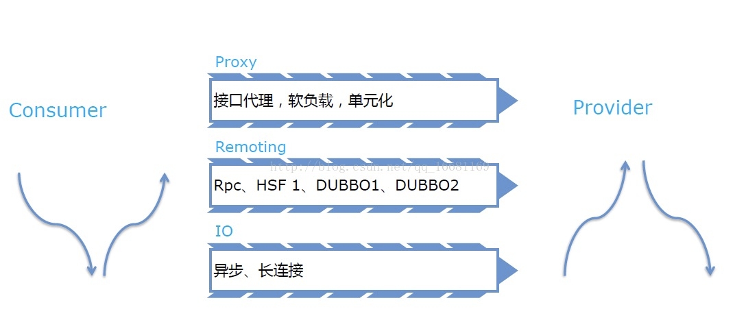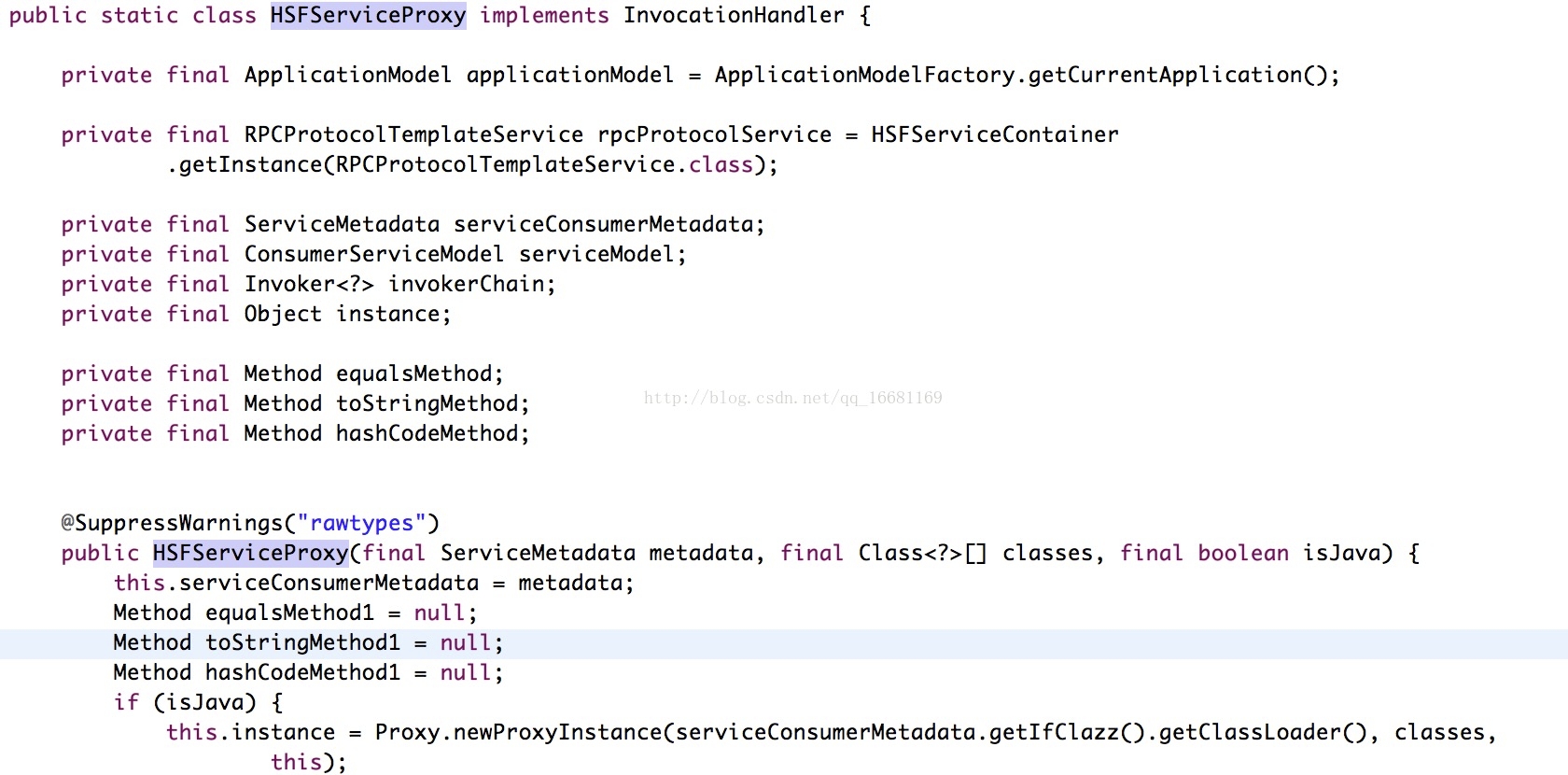 HSF最大优点是非侵入性,它使用了JAVA的Proxy机制来实现这一特点,在通过xml配置文件配置Consumer的时候,实际上是调用了 HSFApiConsumerBean ,在它的初始化方法中,读取了配置的实现接口,并在ProcessComponent中用一个封装了Proxy注册功能,并实现了InvocationHandler接口的类HSFServiceProxy去管理。使用者在自己的代码中无需做任何特殊处理,就像使用本地方法一样去调用其方法。