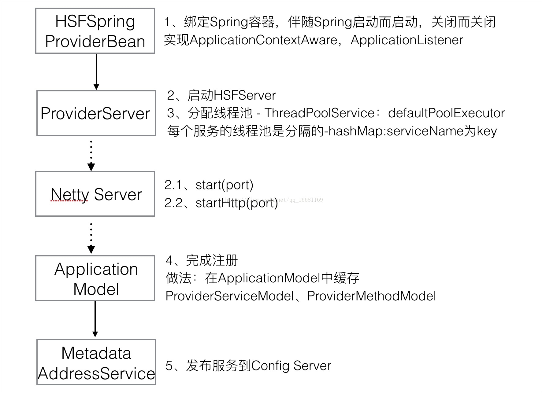 从图中可以看出,HSF的实现方式可以理解为是C/S的架构,但是和传统的C/S架构相比还是有很大的不同,HSF没有真正的服务器,每个应用都可以成为服务的调用方和提供方。具体工作方式如下: