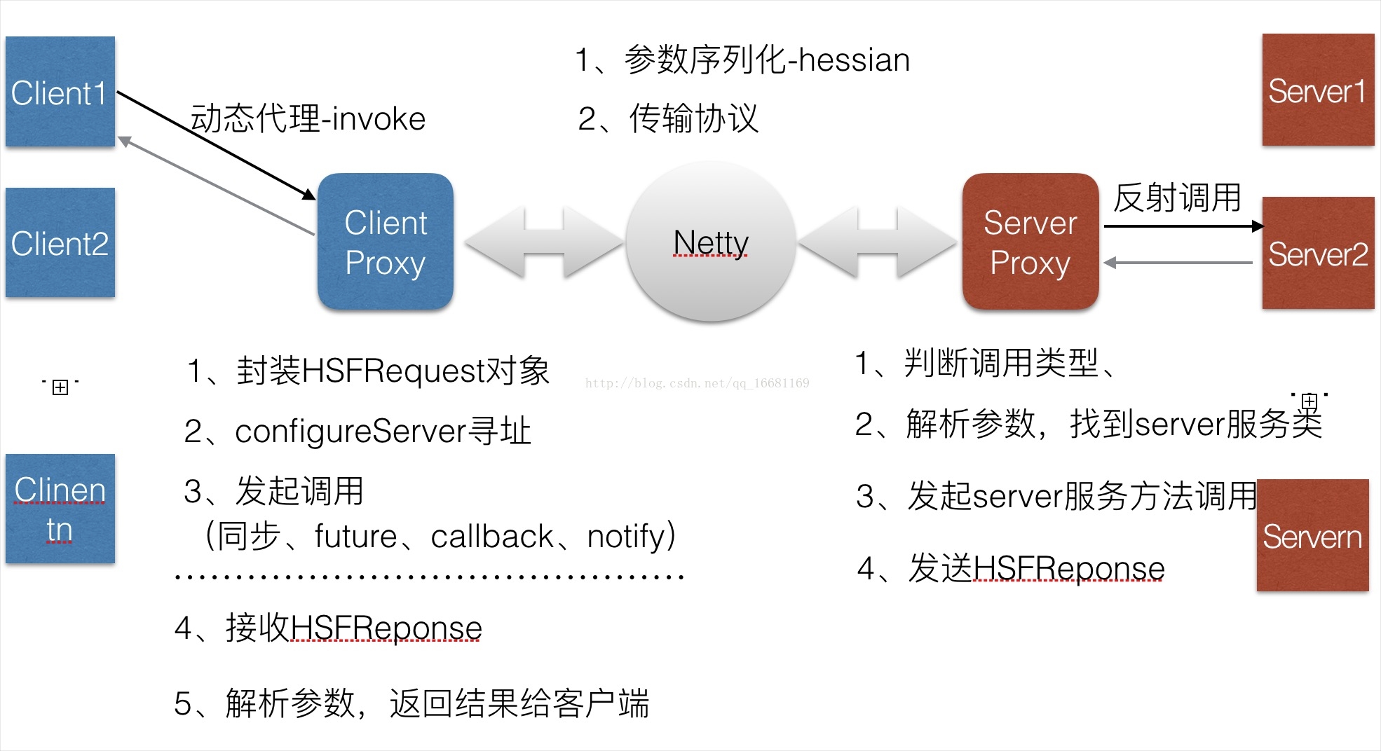 **网络通信:**HSF的底层网络通信是使用netty框架实现的,是基于epoll的NIO的网络通讯框架,HSF在此使用的是长连接,通过合理的服务部署及负债均衡,基本不存在I/O方面的限制。