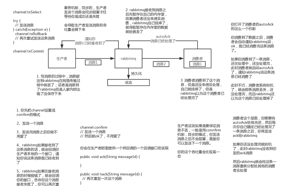 哪怕是你给RabbitMQ开启了持久化机制,也有一种可能,就是这个消息写到了RabbitMQ中,但是还没来得及持久化到磁盘上,结果不巧,此时RabbitMQ挂了,就会导致内存里的一点点数据会丢失。