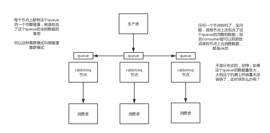 实际上rabbitmq之类的,并不是分布式消息队列,他就是传统的消息队列,只不过提供了一些集群、HA的机制而已,因为无论怎么玩儿,RabbitMQ一个queue的数据都是放在一个节点里的,镜像集群下,也是每个节点都放这个queue的完整数据。