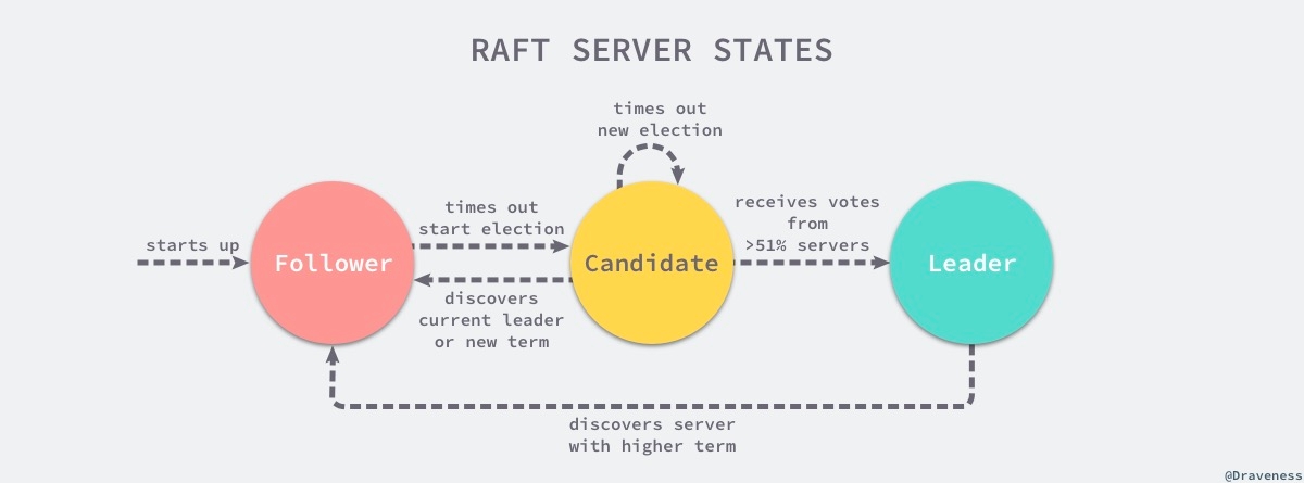 所有的 Follower 节点都是被动的,它们不会主动发出任何的请求,只会响应 Leader 和 Candidate 发出的请求,对于每一个用户的可变操作,都会被路由给 Leader 节点进行处理,除了 Leader 和 Follower 节点之外,Candidate 节点其实只是集群运行过程中的一个临时状态。