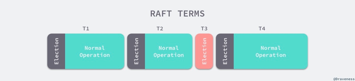 Raft 集群中的时间也被切分成了不同的几个任期(Term),每一个任期都会由 Leader 的选举开始,选举结束后就会进入正常操作的阶段,直到 Leader 节点出现问题才会开始新一轮的选择。