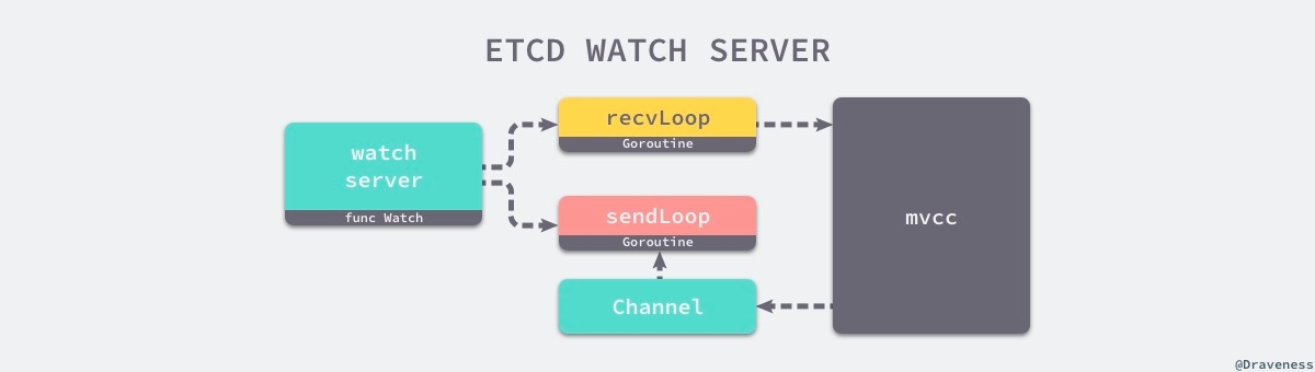 对于每一个 Watch 请求来说,watchServer 会根据请求创建两个用于处理当前请求的 Goroutine,这两个协程会与更底层的 mvcc 模块协作提供监听和回调功能: