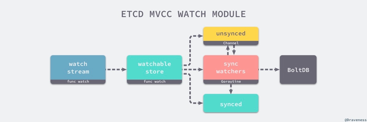 上述图片中展示了 mvcc 模块对于向外界提供的监听某个 Key 和范围的接口,外部的其他模块会通过 watchStream.watch 函数与模块内部进行交互,每一次调用 watch 方法最终都会向 watchableStore 持有的 watcherGroup 中添加新的 watcher 结构。