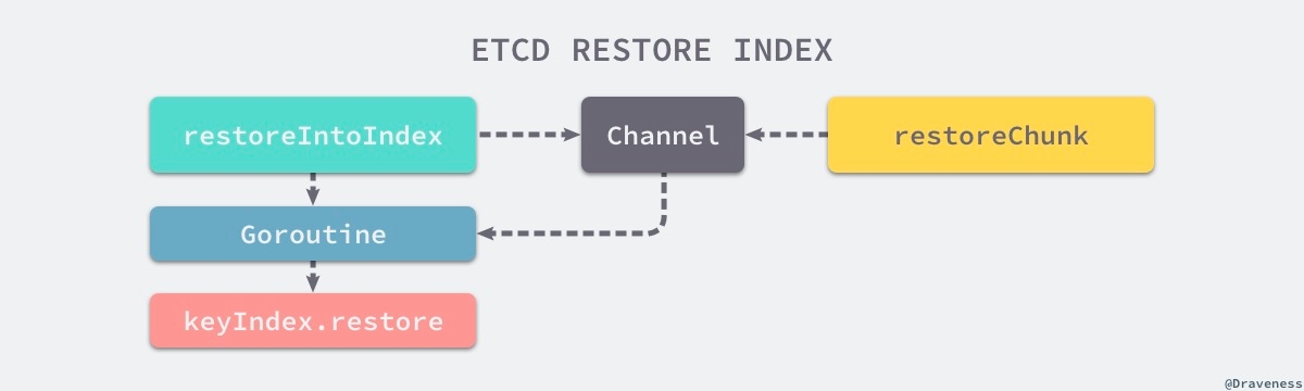 在恢复索引的过程中,有一个用于遍历不同键值的『生产者』循环,其中由 UnsafeRange 和 restoreChunk 两个方法构成,这两个方法会从 BoltDB 中遍历数据,然后将键值对传到 rkvc 中,交给 restoreIntoIndex 方法中创建的 goroutine 处理: