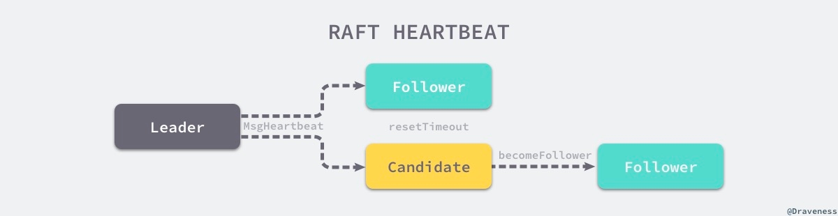 Follower 与 Candidate 会根据节点类型的不同做出不同的响应,两者收到心跳请求时都会重置节点的选举超时时间,不过后者会将节点的状态直接转变成 Follower: