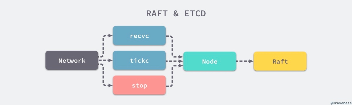 作者对整个循环内的代码进行了简化,因为当前只需要关心三个 Channel 中的消息,也就是用于接受其他节点消息的 recvc、用于触发定时任务的 tickc 以及用于暂停当前节点的 stop。