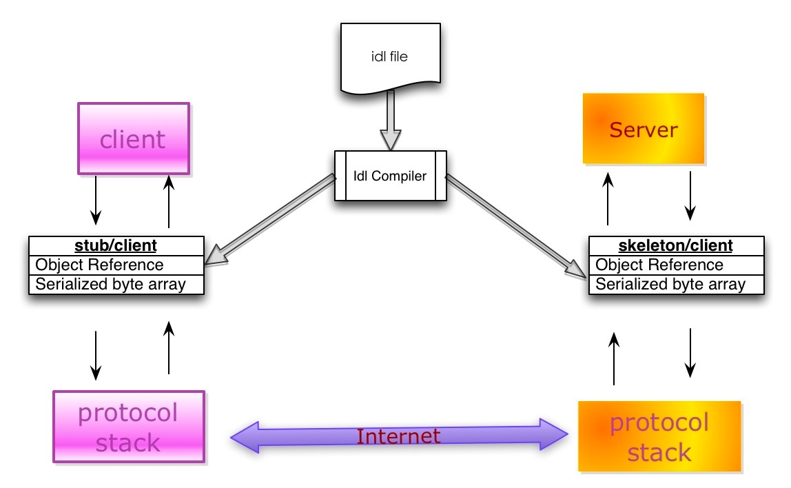 IDL(Interface description language)文件:参与通讯的各方需要对通讯的内容需要做相关的约定(Specifications)。为了建立一个与语言和平台无关的约定,这个约定需要采用与具体开发语言、平台无关的语言来进行描述。这种语言被称为接口描述语言(IDL),采用IDL撰写的协议约定称之为IDL文件。IDL Compiler:IDL文件中约定的内容为了在各语言和平台可见,需要有一个编译器,将IDL文件转换成各语言对应的动态库。Stub/Skeleton Lib:负责序列化和反序列化的工作代码。Stub是一段部署在分布式系统客户端的代码,一方面接收应用层的参数,并对其序列化后通过底层协议栈发送到服务端,另一方面接收服务端序列化后的结果数据,反序列化后交给客户端应用层;Skeleton部署在服务端,其功能与Stub相反,从传输层接收序列化参数,反序列化后交给服务端应用层,并将应用层的执行结果序列化后最终传送给客户端Stub。Client/Server:指的是应用层程序代码,他们面对的是IDL所生存的特定语言的class或struct。底层协议栈和互联网:序列化之后的数据通过底层的传输层、网络层、链路层以及物理层协议转换成数字信号在互联网中传递。