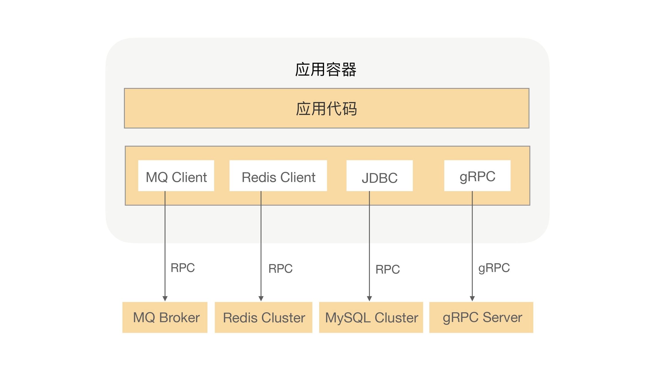 在这个应用中,我使用了 MQ 来处理异步流程、Redis 缓存热点数据、MySQL 持久化数据,还有就是在系统中调用另外一个业务系统的接口,对我的应用来说这些都是属于 RPC 调用,而 MQ、MySQL 持久化的数据也会存在于一个分布式文件系统中,他们之间的调用也是需要用 RPC 来完成数据交互的。