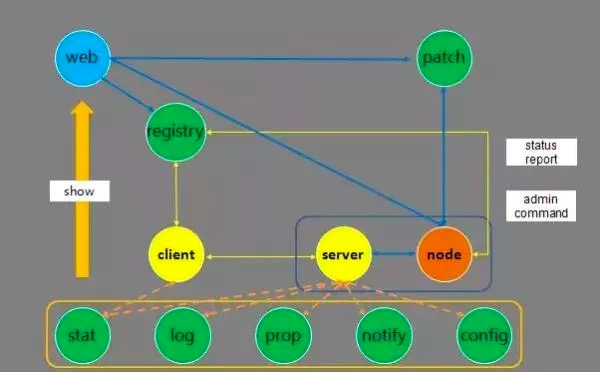 管理命令流程:web 系统上的可以提交管理 server 服务命令请求,由 registry 服务传达到 node 服务,然后由 node 向 server 发送管理命令。