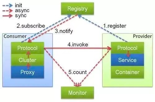从图中你能看到,Dubbo 的架构主要包含四个角色,其中 Consumer 是服务消费者,Provider 是服务提供者,Registry 是注册中心,Monitor 是监控系统。