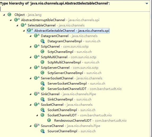 serverChannel.register(Selector sel, int ops, Object att): 实际上register(Selector sel, int ops, Object att)方法是ServerSocketChannel类的父类AbstractSelectableChannel提供的一个方法,表示只要继承了AbstractSelectableChannel类的子类都可以注册到选择器中。通过观察整个AbstractSelectableChannel继承关系,下图中的这些类可以被注册到选择器中: