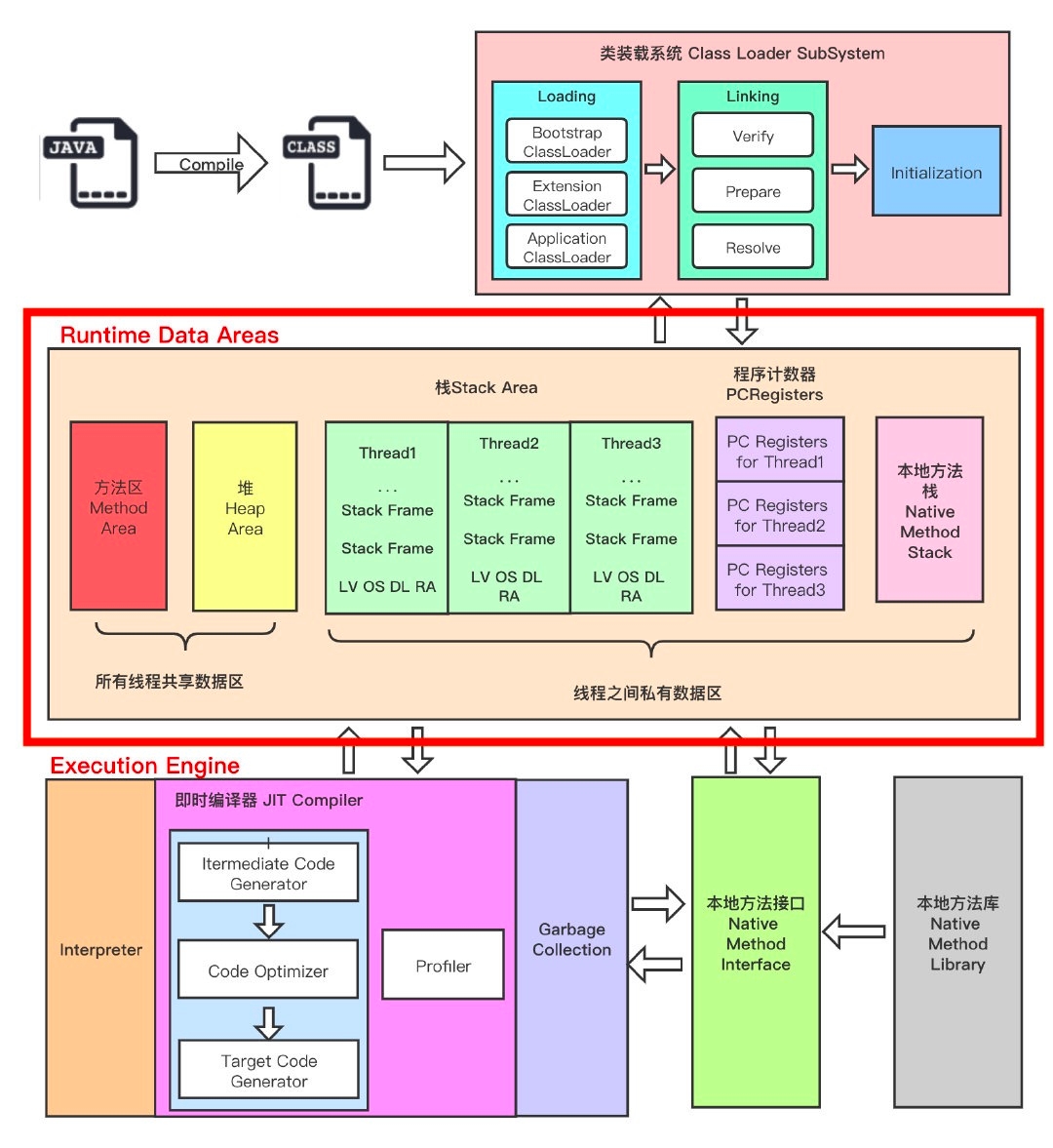 下图是 JVM 整体架构,中间部分就是 Java 虚拟机定义的各种运行时数据区域。