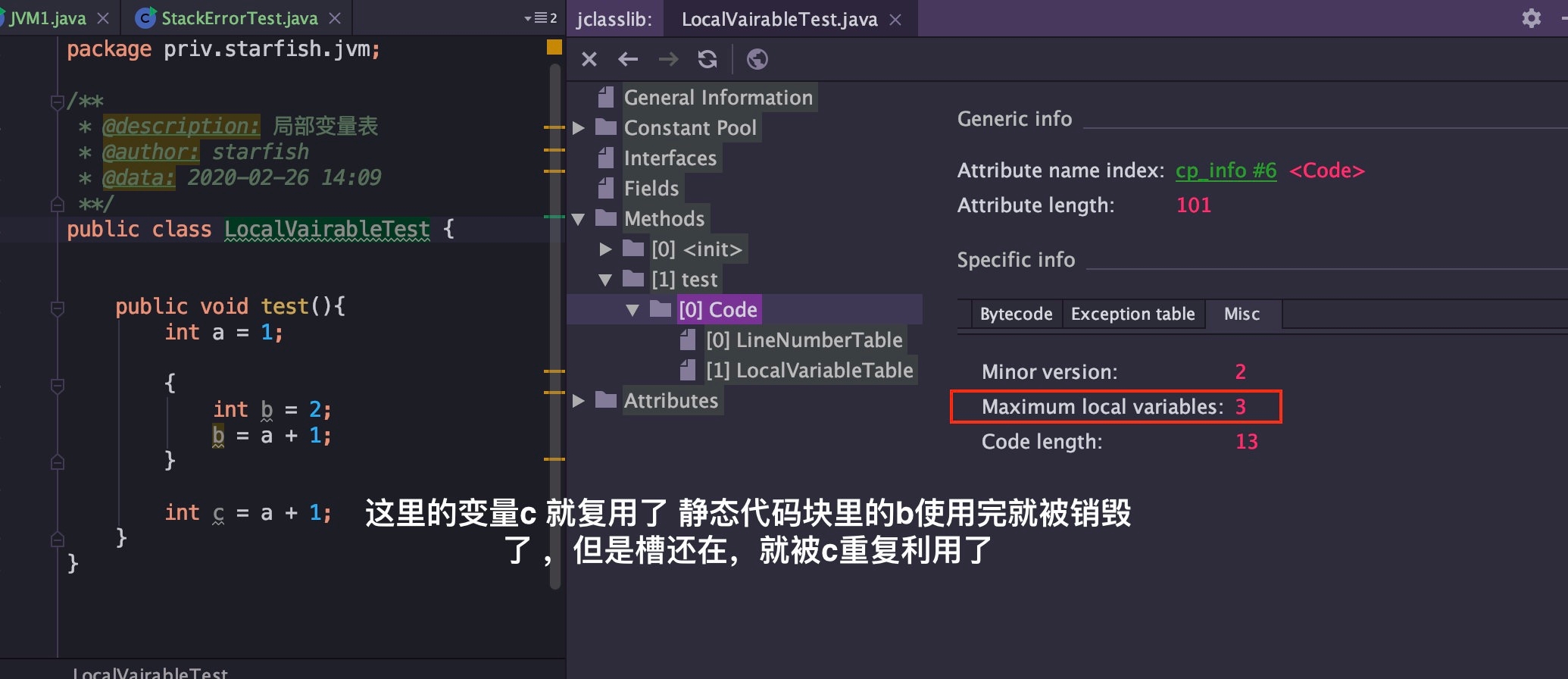 栈帧中的局部变量表中的槽位是可以重用的,如果一个局部变量过了其作用域,那么在其作用域之后申明的新的局部变量就很有可能会复用过期局部变量的槽位,从而达到节省资源的目的。(下图中,this、a、b、c 理论上应该有 4 个变量,c 复用了 b 的槽)。