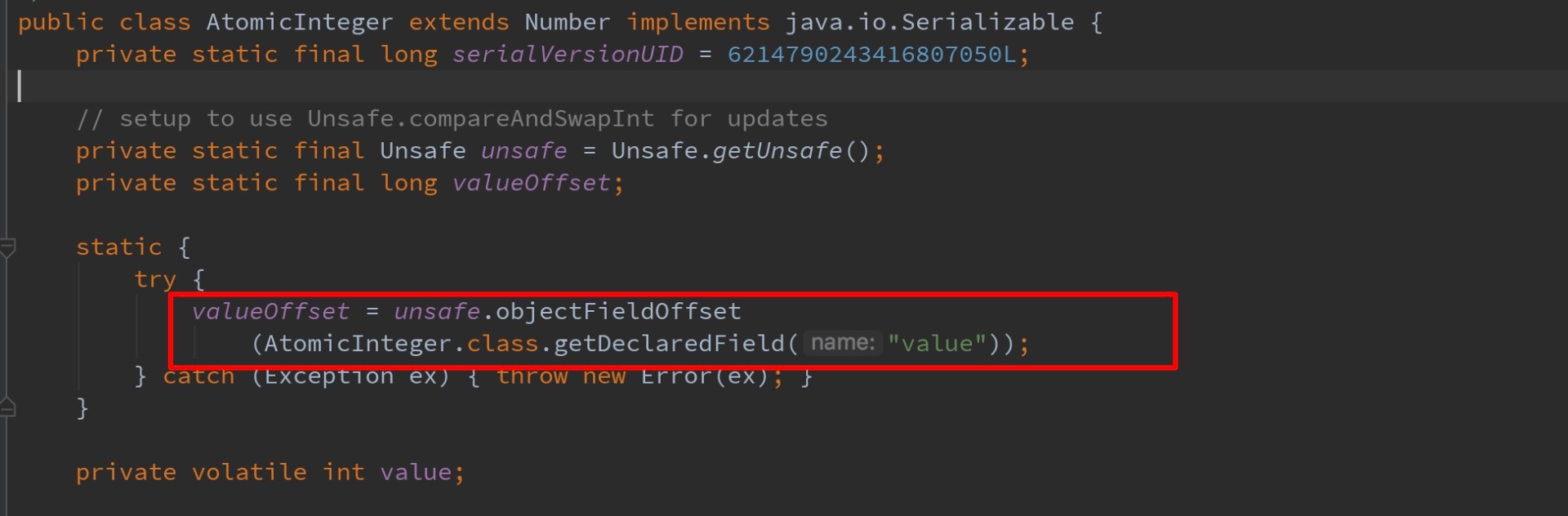 CAS在java.util.concurrent.atomic相关类、Java AQS、CurrentHashMap等实现上有非常广泛的应用。如下图所示,AtomicInteger的实现中,静态字段valueOffset即为字段value的内存偏移地址,valueOffset的值在AtomicInteger初始化时,在静态代码块中通过Unsafe的objectFieldOffset方法获取。在AtomicInteger中提供的线程安全方法中,通过字段valueOffset的值可以定位到AtomicInteger对象中value的内存地址,从而可以根据CAS实现对value字段的原子操作。