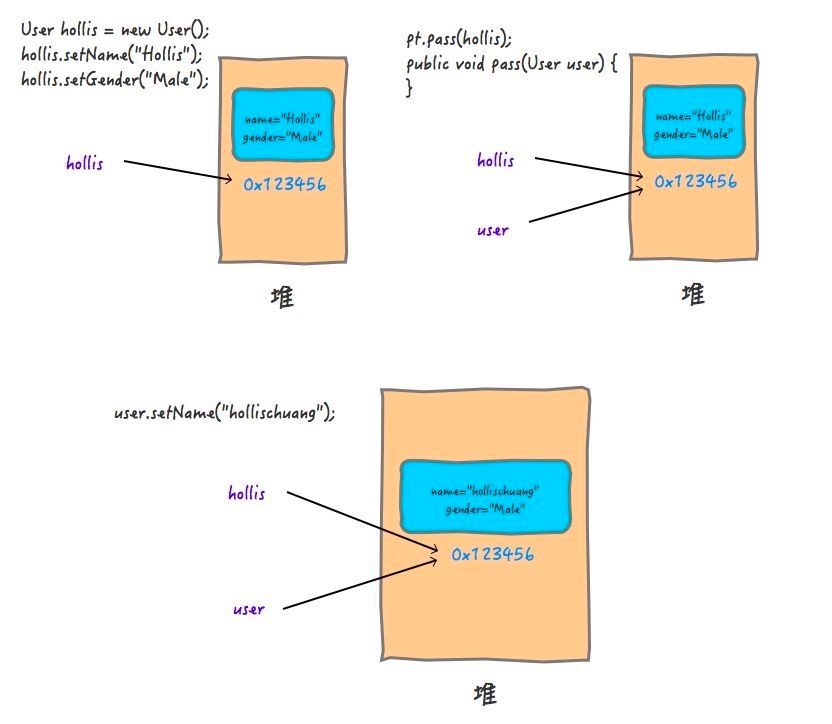 那么,既然这样,为啥上面同样是传递对象,传递的String对象和User对象的表现结果不一样呢?我们在pass方法中使用name = "hollischuang";试着去更改name的值,阴差阳错的直接改变了name的引用的地址。因为这段代码,会new一个String,再把引用交给name,即等价于: