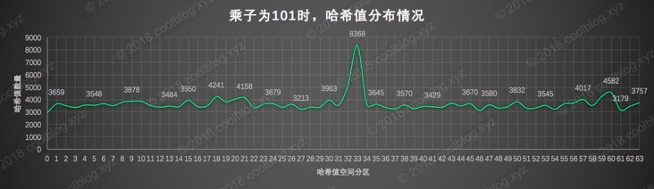最后再来看看大质数101的表现,不难看出,质数101作为乘子时,算出的哈希值分布情况要好于主角31,有点喧宾夺主的意思。不过不可否认的是,质数101的作为乘子时,哈希值的分布性确实更加均匀。所以如果不在意质数101容易导致数据信息丢失问题,或许其是一个更好的选择。