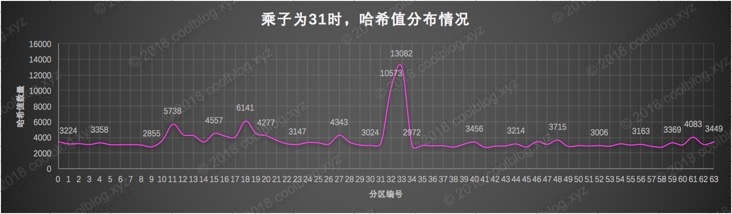 接下来来看看我们本文的主角31了,31作为乘子算出的哈希值在第33分区有一定的小聚集。不过相比于数字17,主角31的表现又好了一些。首先是哈希值的聚集程度没有17那么严重,其次哈希值在其他区分布的情况也要好于17。总之,选31,准没错啊。